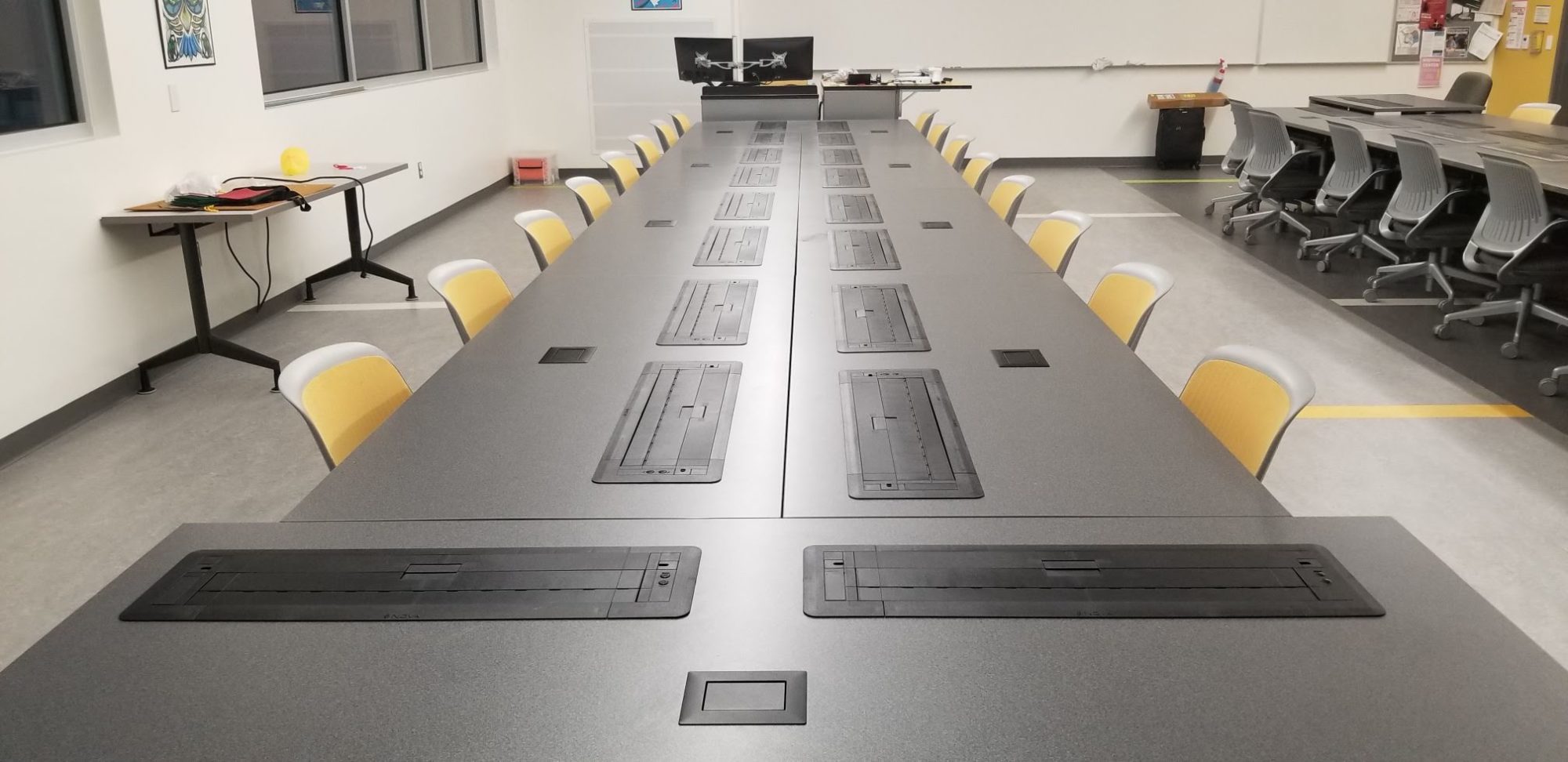 This installation with Mission College in Santa Clara features NOVA’s Trolley™ Monitor Lift Computer Tables with Arched Legs. These tables were the perfect fit for the layout of the room so they could utilize the most space. Today's learning environment is moving digital and NOVA's Trolley Monitor Lift Visual Display Option is the perfect fit to accommodate the technology. The Trolley™ consists of a low voltage electric motor that allows the monitor to lift and rise. The Display submerges into a desktop when it is not in use.