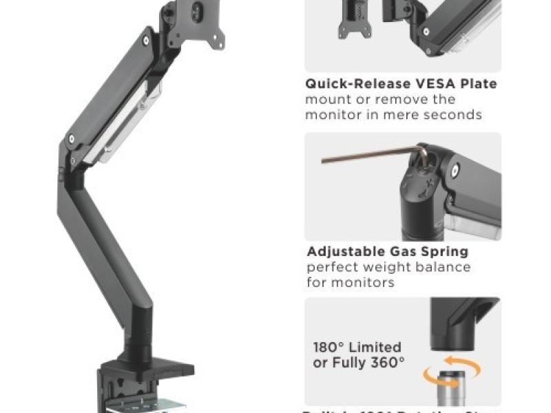Our Aluminum Heavy-Duty Gas Spring Monitor Arm fits monitors from 17"~49" and holds up to 18kg/39.6lbs, allowing even the largest and heaviest monitors to position with ease - move up, down, forward and back with a gentle touch. Larger screen means bigger risk, we set an added screw behind the arm to prevent your mis operation extending the arm past the rear edge of desk.