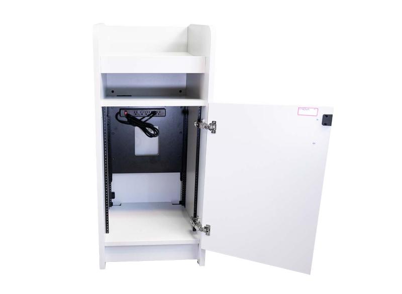 NOVA's Podium with Angled Top and Privacy Sides comes standard with a pencil lip and a fixed shelf. The shelf is the perfect space for hidden storage from the audience for any presentation accessory. The privacy sides provide security as well as privacy to the speaker to allow them the ultimate experience. If the podium is being used in an environment with customers, it is the natural solution for the employee to be able to protect information and useful data from the consumer during an interaction.